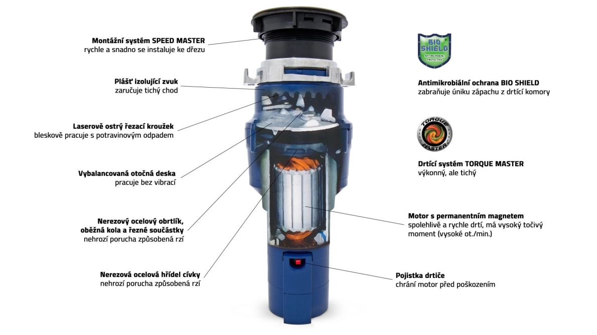 Waste Maid motory nabízejí maximální točivý moment, okamžitý rozběh a velmi vysoké otáčky, což prakticky znemožňuje zaseknutí přístroje.